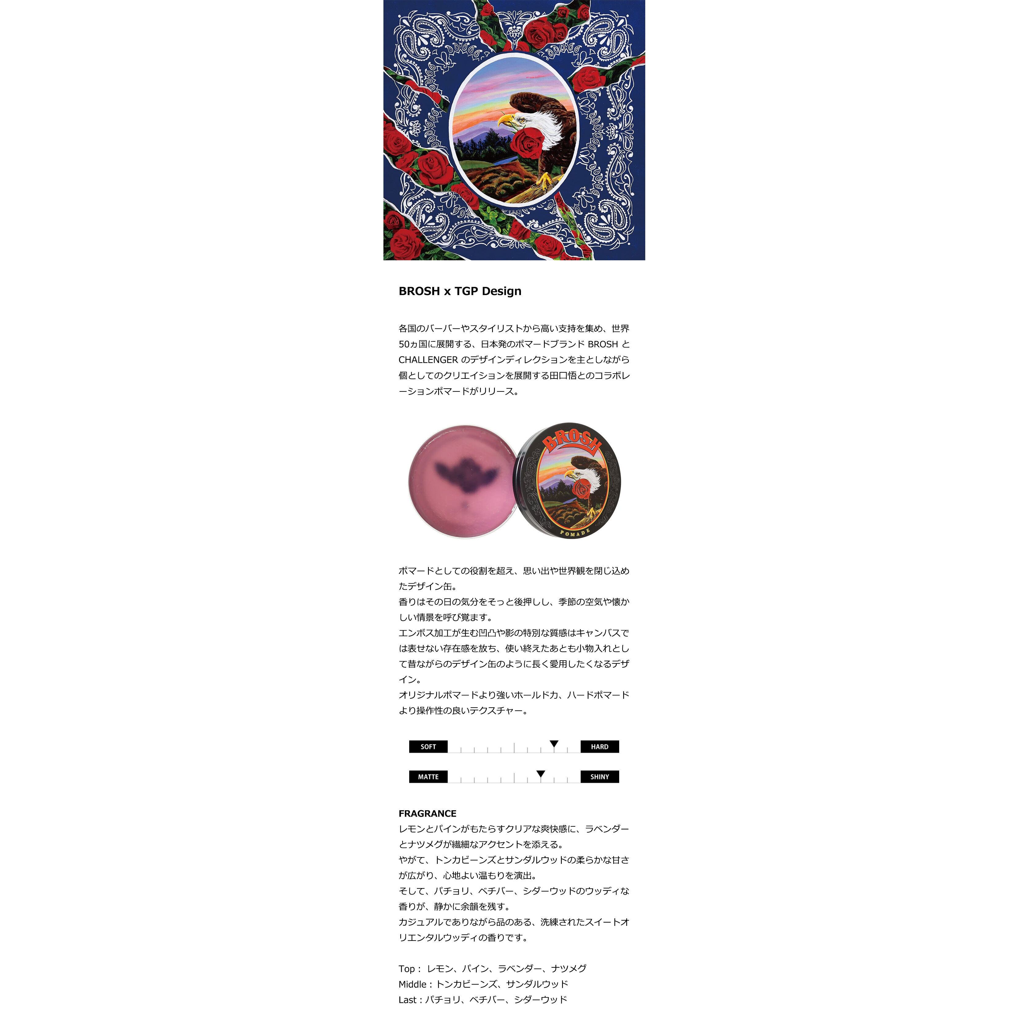 各国のバーバーやスタイリストから高い支持を集め、世界50ヵ国に展開する、日本発のポマードブランド BROSH と CHALLENGER のデザインディレクションを主としながら個としてのクリエイションを展開する田口悟とのコラボレ ーションポマードがリリース。