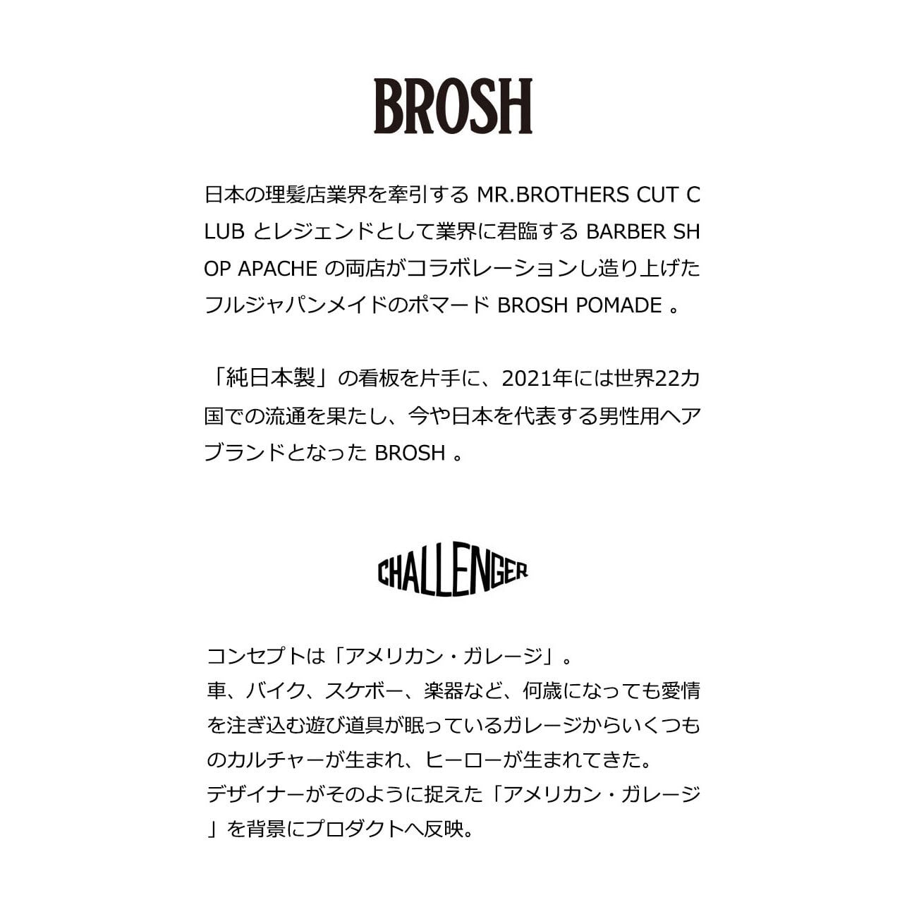 各国のバーバーやスタイリストから高い支持を集め、世界50ヵ国に展開する日本発のポマードブランド BROSH と「アメリカンガレージ」をコンセプトに、車やバイク、スケボーなど、男がいくつになっても離れられない要素をふんだんに盛り込むブランド CHALLENGER のコラボレーションポマード。