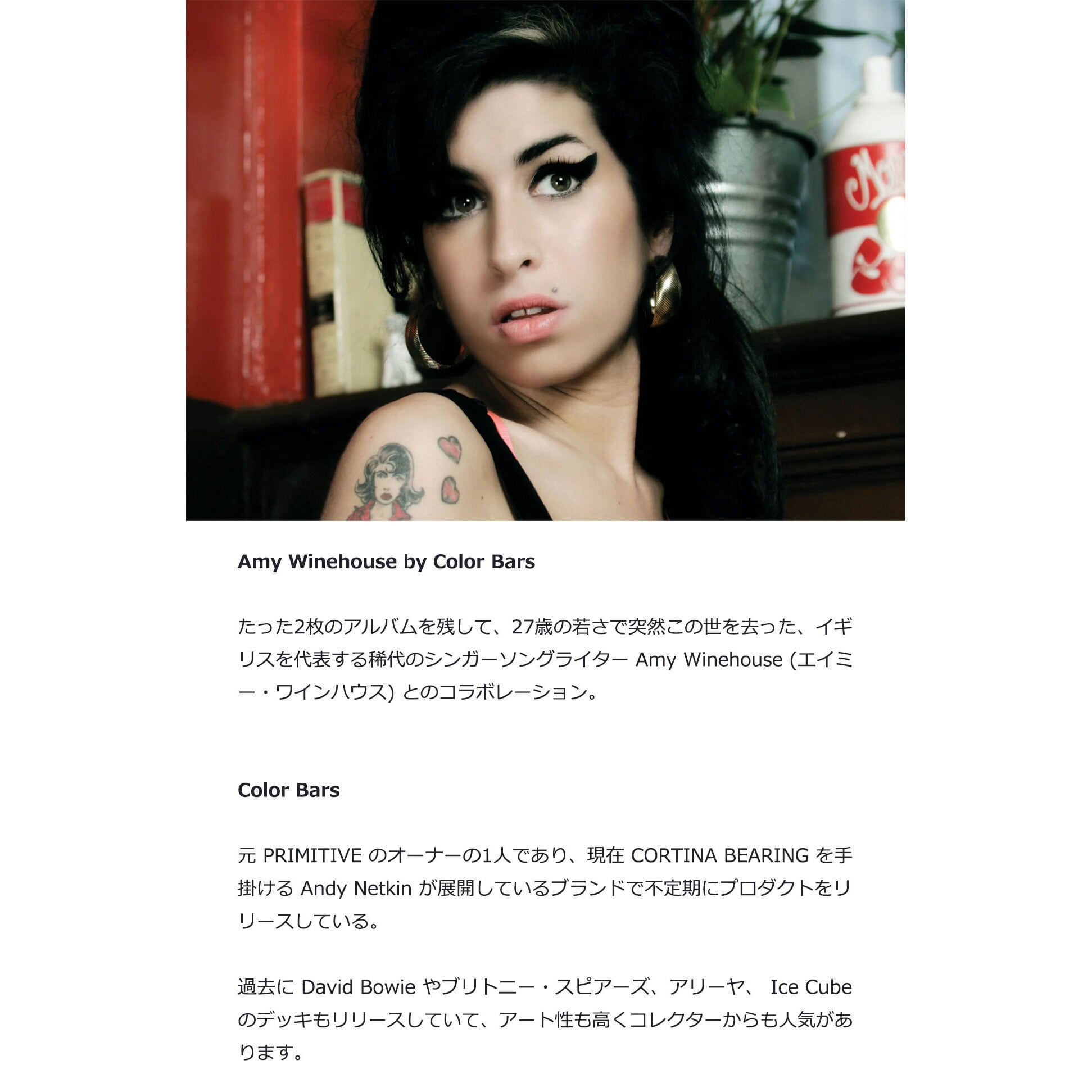 たった2枚のアルバムを残して、27歳の若さで突然この世を去った、イギリスを代表する稀代のシンガーソングライター、エイミー・ワインハウスと Color Bars のコラボレーションTシャツになります。