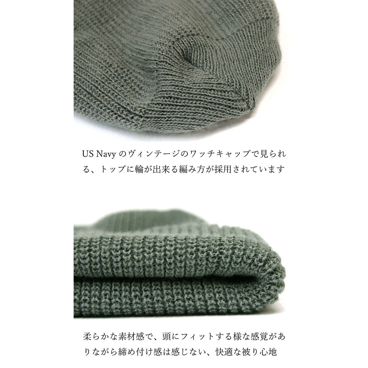 US Navy (アメリカ海軍) のヴィンテージのワッチキャップ (ウオッチキャップ) で見られる、トップに輪が出来る編み方が採用されているニット帽です。