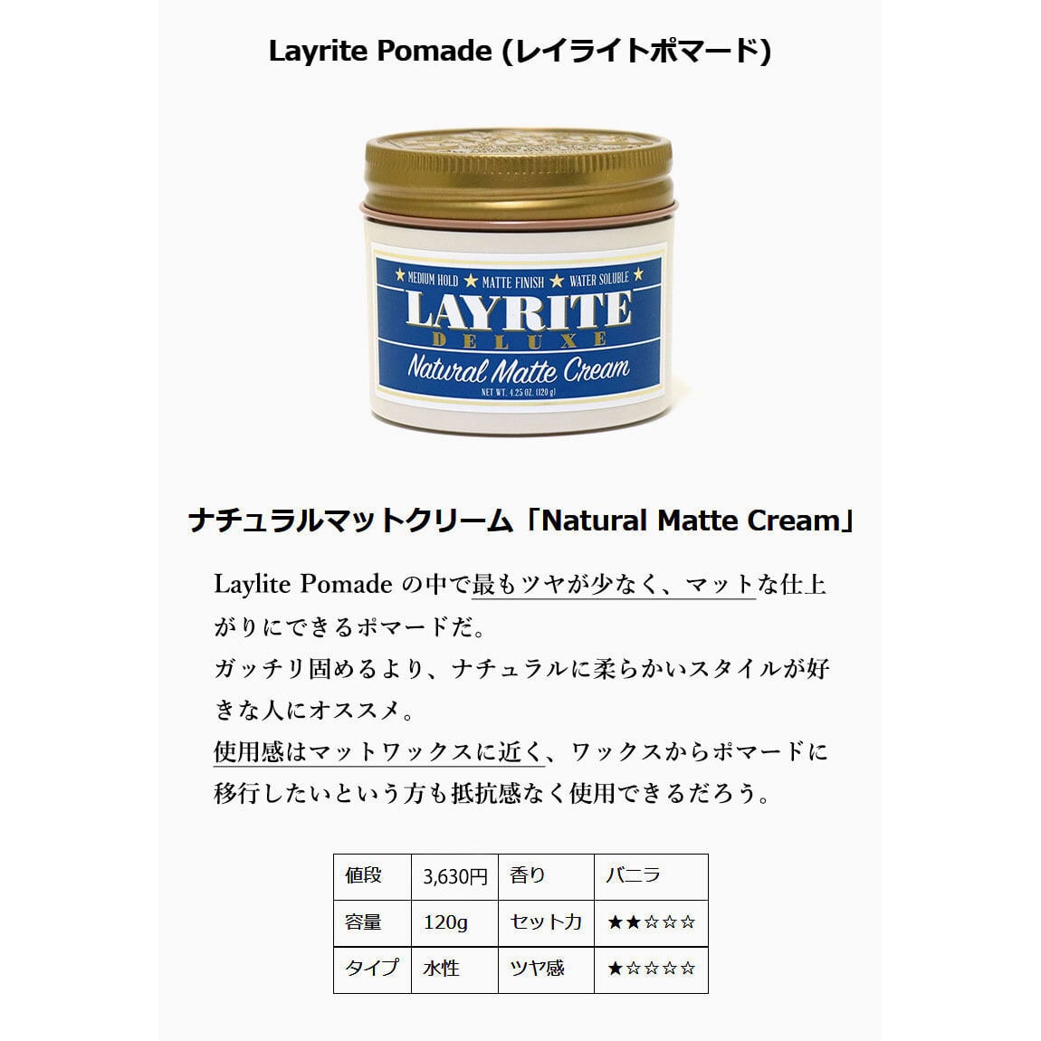 10/18(土) 再入荷 / 【正規輸入品】 LAYRITE (レイライト) NATURAL MATTE CREAM 120g レイライト ポマード 水性 アメリカ 製 バーバー マット ワックス layrite アメリカ 製 ヘア クリーム メンズ 整髪料 男性用 パーマ スタイリング剤 バニラ 香り | OSS