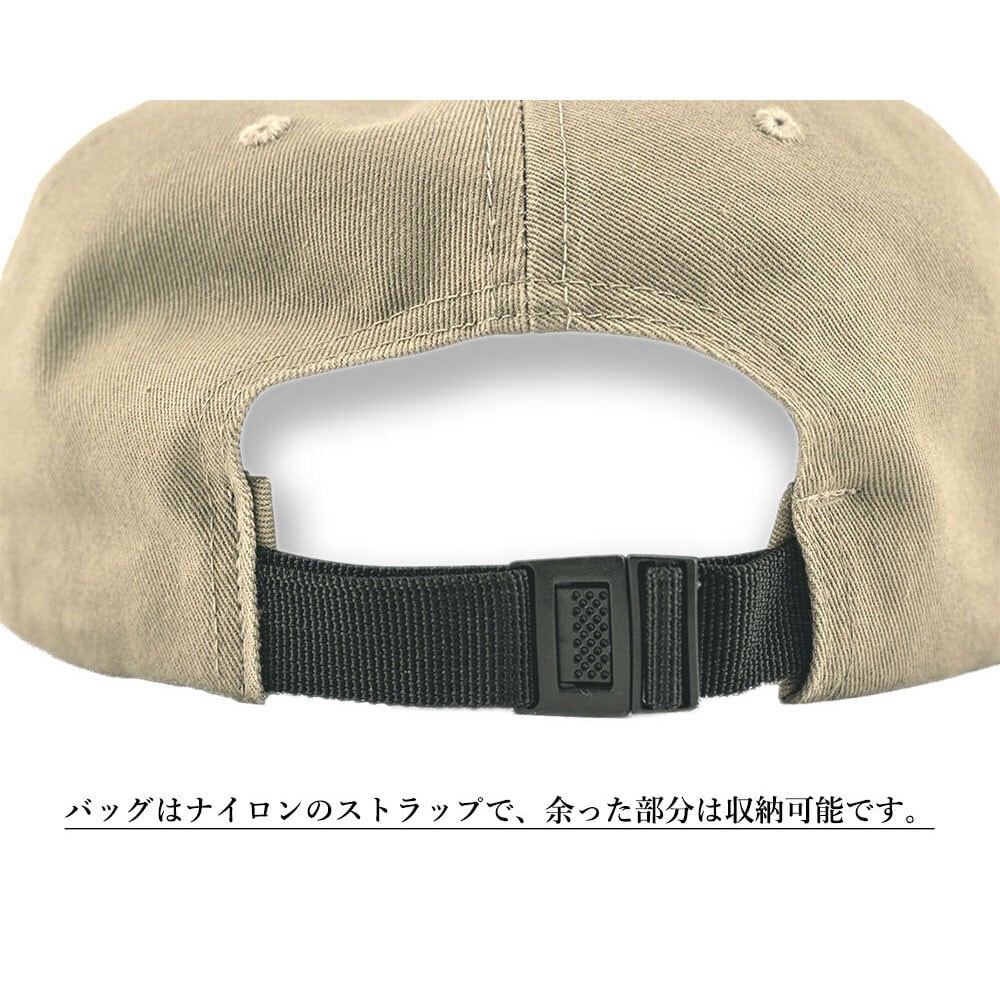 バックは定番のプラスチックバンド (通称パチパチ) ではなく、ジェットキャップでお馴染みのナイロンのストラップ。 (余った部分は収納可能)