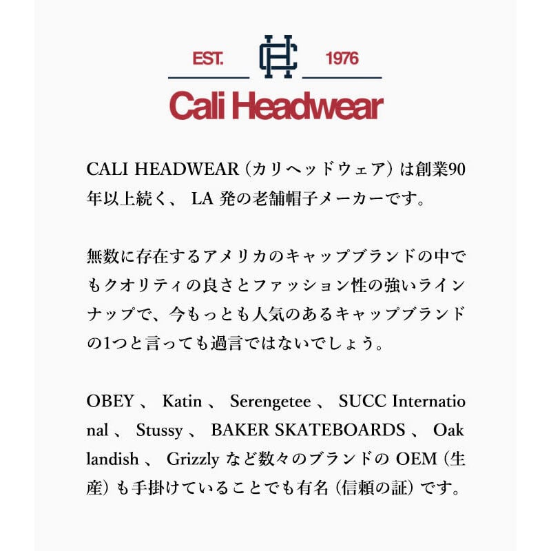 OBEY 、 Katin 、 Serengetee 、 SUCC International 、 Stussy 、 BAKER SKATEBOARDS 、 Oaklandish 、 Grizzly など数々のブランドの OEM (生産) も手掛けているカリフォルニアの老舗帽子メーカー Cali Headwear (キャリヘッドウェア) 。