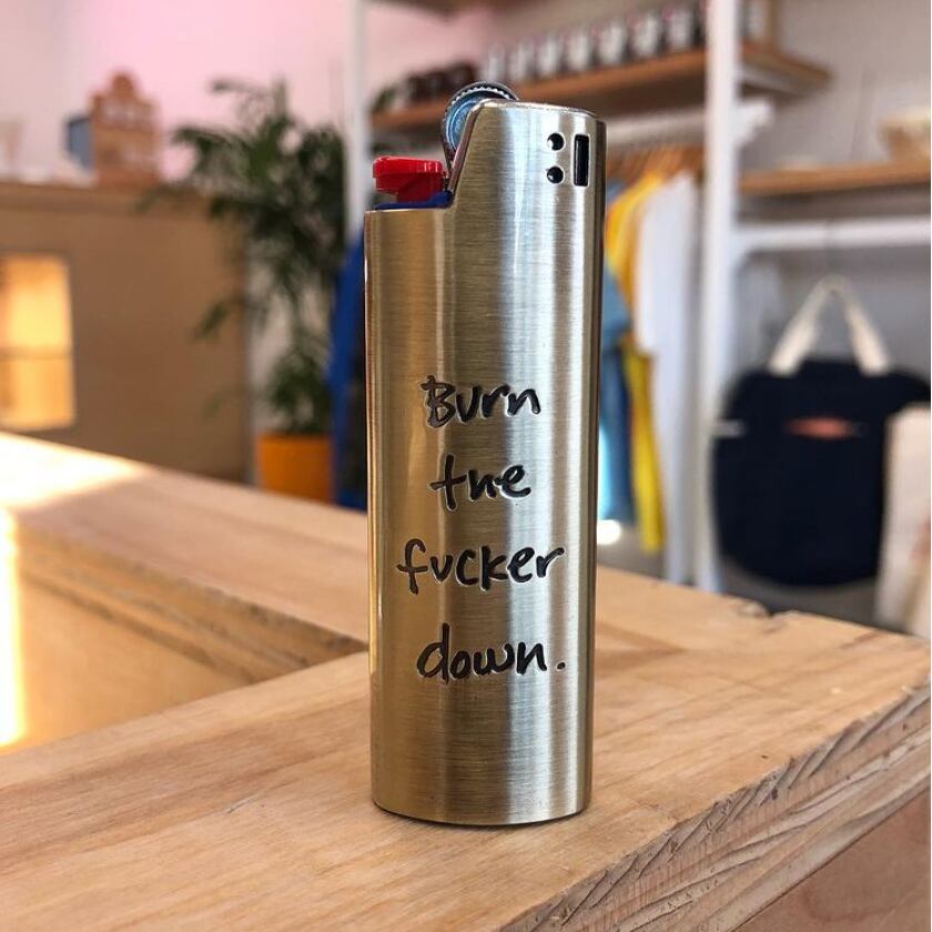 真鍮製のケースの片面にメッセージ「Burn the fucker down.」、もう片面に「Good Worth」ロゴがデボス加工 (凹凸) で落とし込まれています。