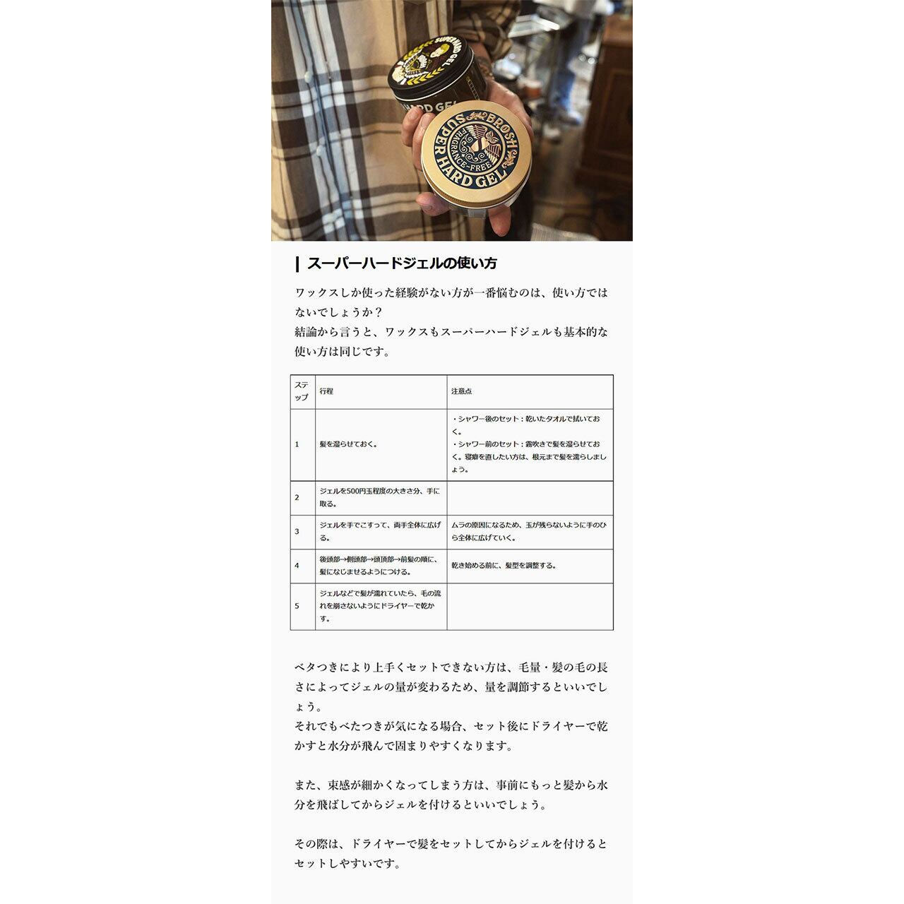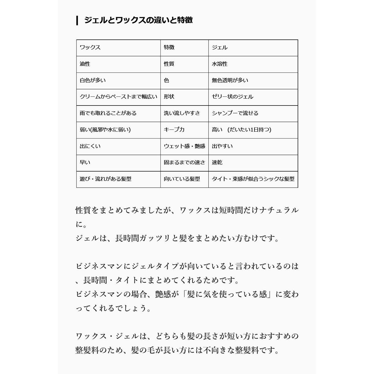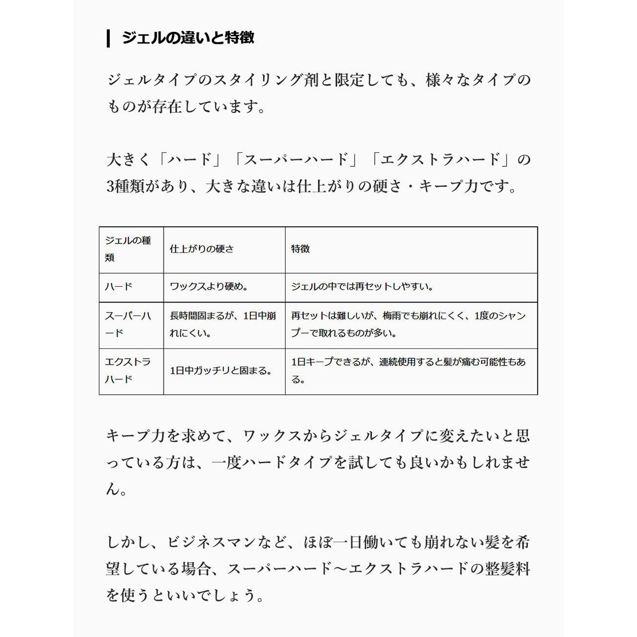 キープ力はエクストラハードに近く (ジェルには大きく「ハード」、「スーパーハード」、「エクストラハード」の3種類あります) 、従来のハードジェルよりもジェルに粘り気があるため、1日中髪型が崩れる心配なく使えるビジネスマン仕様!