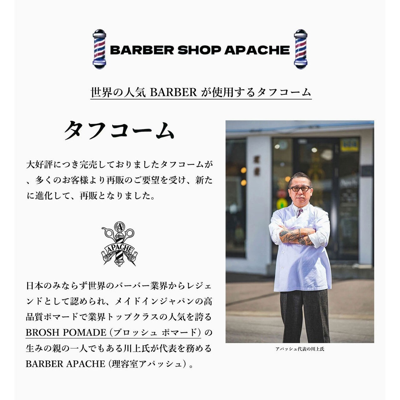 日本のみならず世界のバーバー業界からレジェンドとして認められ、メイドインジャパンの高品質ポマードで業界トップクラスの人気を誇る BROSH POMADE (ブロッシュ ポマード) の生みの親の一人でもある川上氏が代表を務める BARBER APACHE (理容室アパッシュ) 。