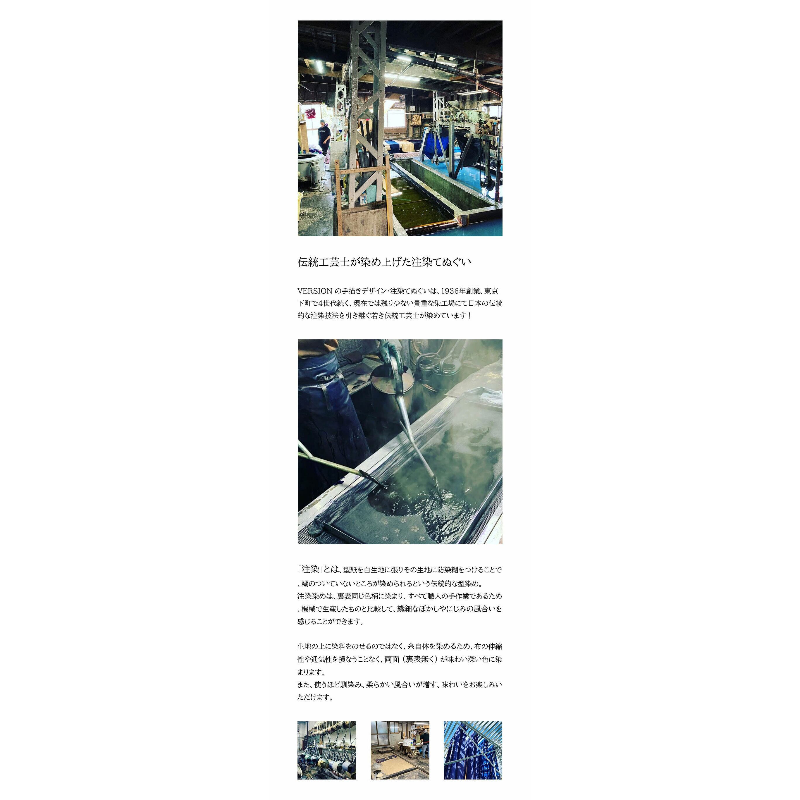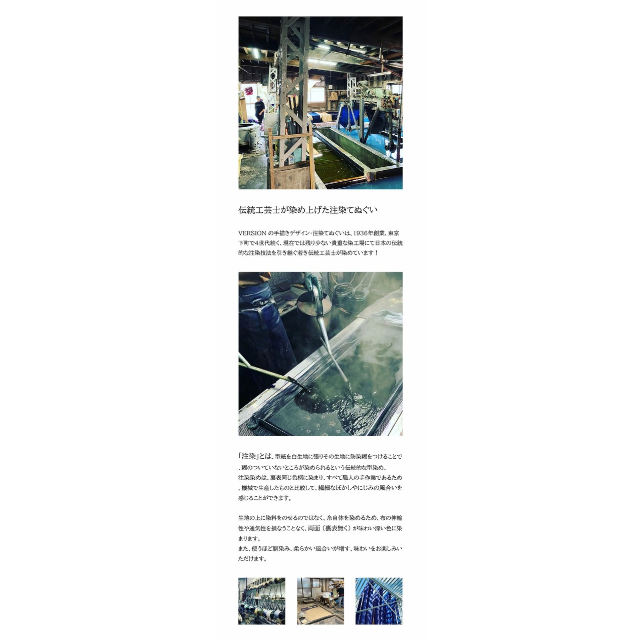 VERSION の手描きデザイン・注染てぬぐいは、1936年創業、東京下町で4世代続く、現在では残り少ない貴重な染工場にて日本の伝統的な注染技法を引き継ぐ若き伝統工芸士が染めています!