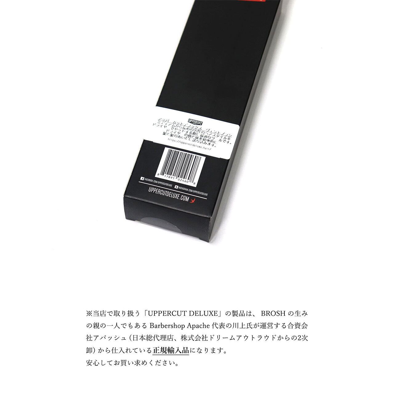※当店で取り扱う「UPPERCUT DELUXE」の製品は、 BROSH の生みの親の一人でもある Barbershop Apache 代表の川上氏が運営する合資会社アパッシュ (日本総代理店、株式会社ドリームアウトラウドからの2次卸) から仕入れている正規輸入品になります。