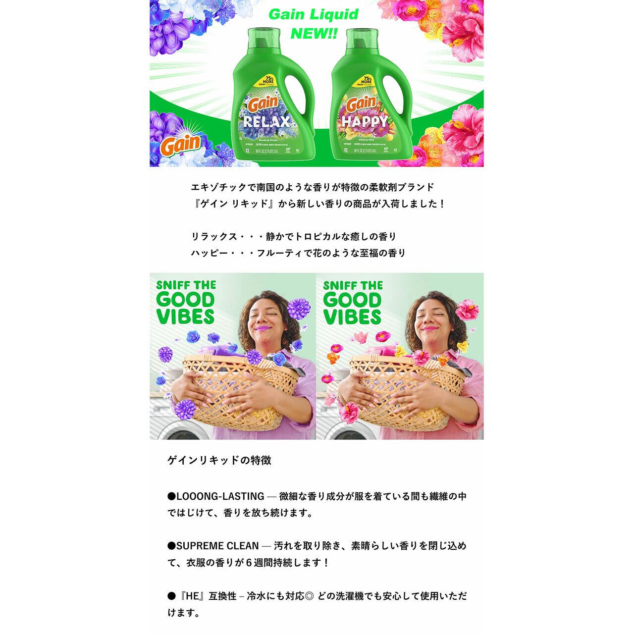 8/11(月) 在庫補充 / Gain (ゲイン) Relax / Happy Liquid Laundry Detergent 88oz/2600ml gain 洗剤 p&g 日用品 海外 洗濯洗剤 ドラム 洗濯 液体 香り 濃縮 タイプ 弱アルカリ性洗剤 P&G プロクター・アンド・ギャンブル 衣類用洗剤 | OSS