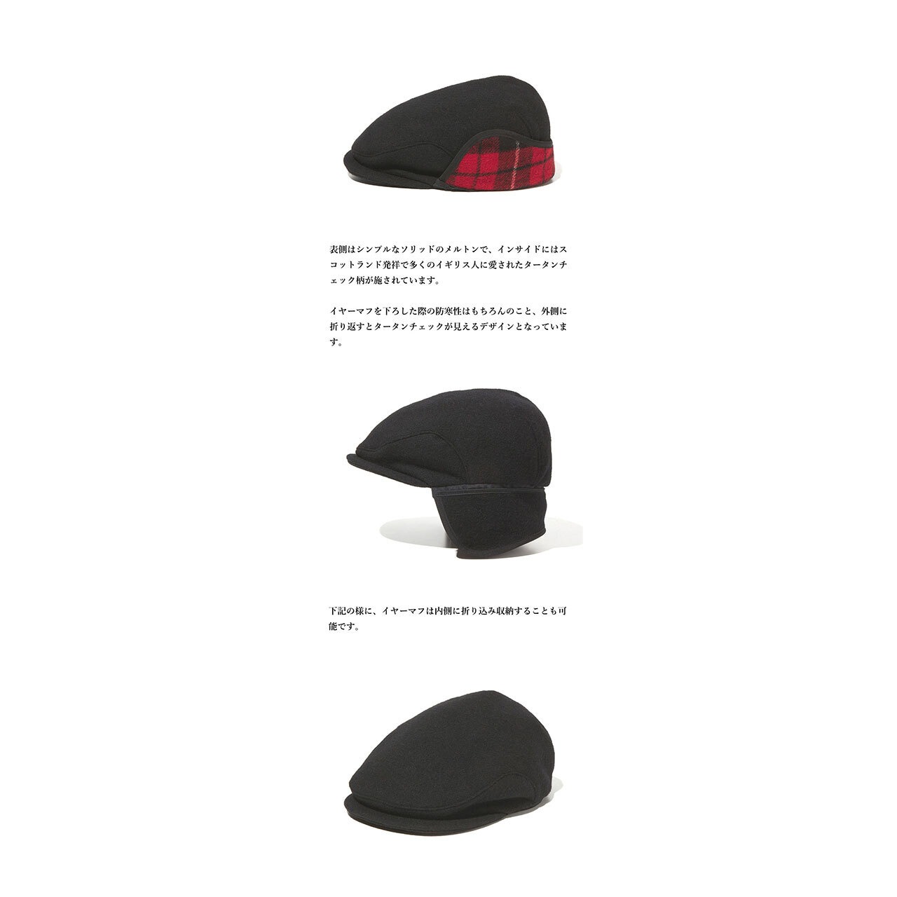 イヤーマフを下ろした際の防寒性はもちろんのこと、外側に折り返すとタータンチェックが見えるデザインとなっています。